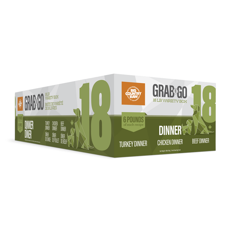 18LB contains 6lbs each: Chicken Dinner, Turkey Dinner and Beef Dinner