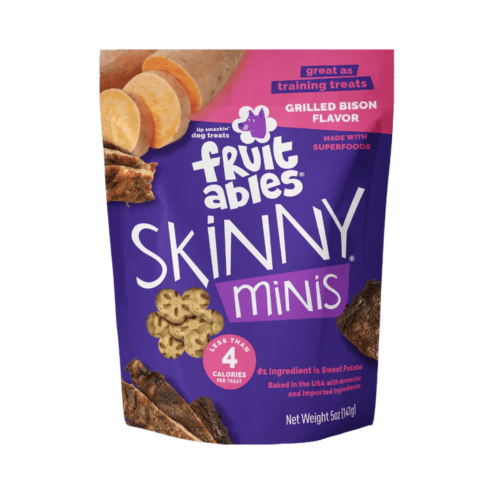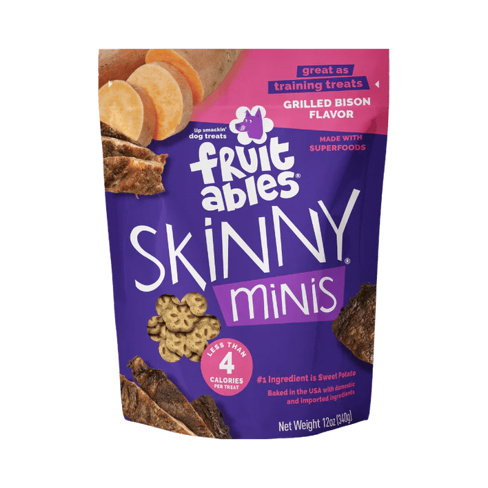 Hot off the grill! Get your little carnivore's attention with the meaty aroma and flavor of these low-calorie grilled bison treats. They're oh-so delicious and healthy, too. Fruitables Skinny Minis Grillws Bison Flavor Treats are CalorieSmart formulated with only 3 calories per treat. Skinny in calories and mini in size, they're made with superfoods making them the perfect treat for small dogs or training.