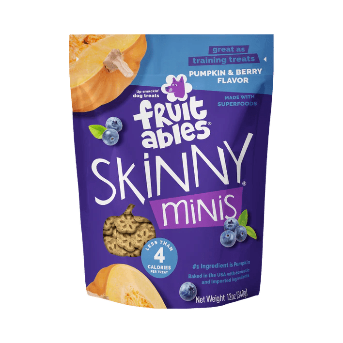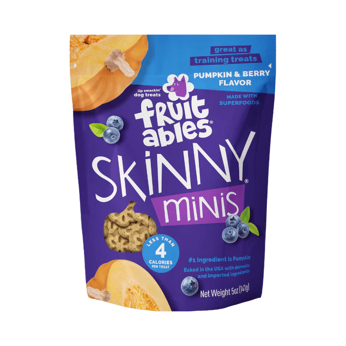 Mmmm, muffins! This mouthwatering recipe is like home-baked goodies in a three-calorie bite. Made with fresh pumpkin and blueberries, these healthy treats are perfect for everyday rewarding. Fruitables Skinny Minis Pumpkin & Berry Flavor Treats are CalorieSmart formulated with only 3 calories per treat. Skinny in calories and mini in size, they're made with superfoods making them the perfect treat for small dogs or training.